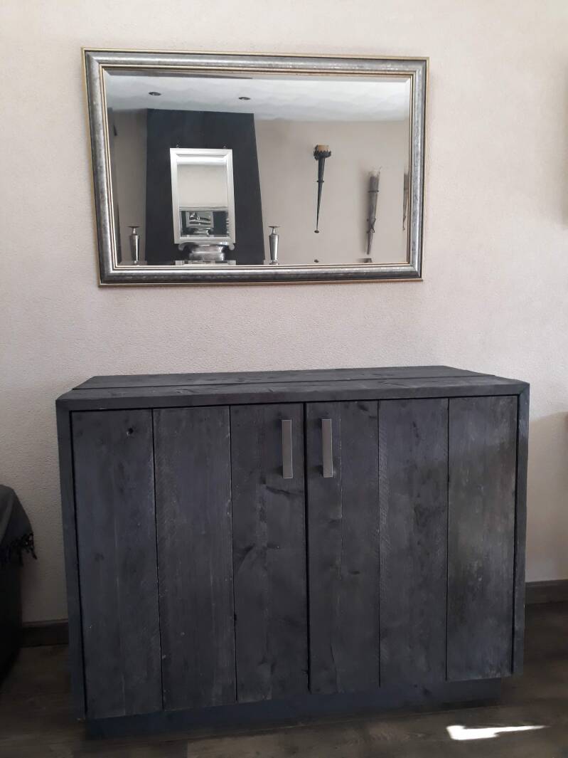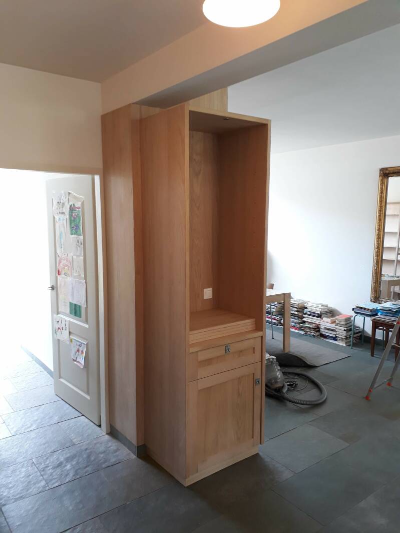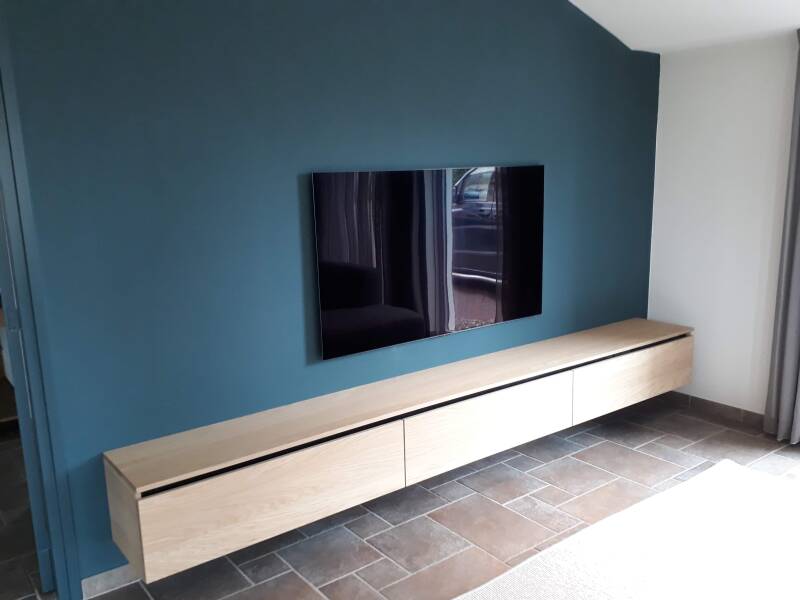 Eikenhouten wandbetimmering en kast met led verlichting.