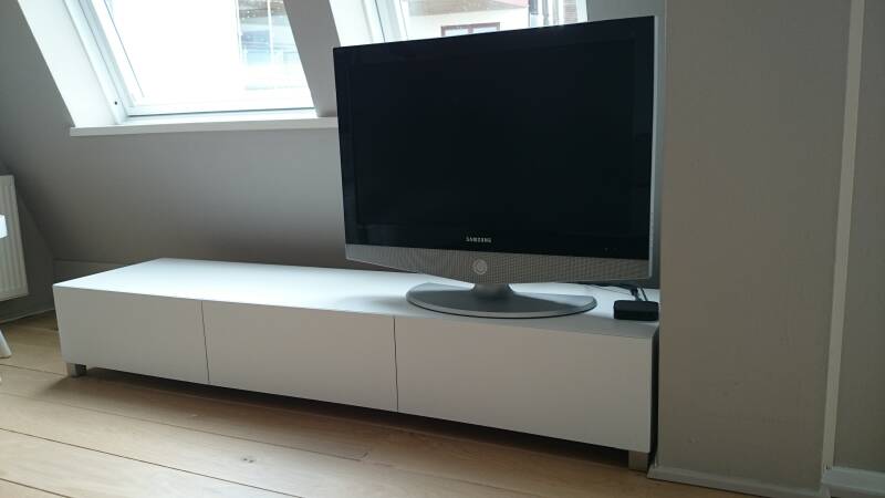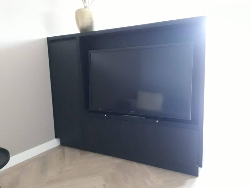 TV meubel gecombineerd met een hoek-opbergkast gemaakt van donker hout