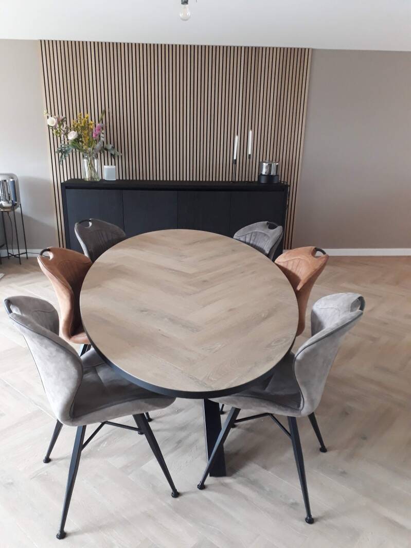 Huiskamerinrichting van gemelamineerd mdf met grove houtstructuur, akoestische achterwand, ovale tafel met zwart stalen poot en beplakt met pvc vloerdelen.