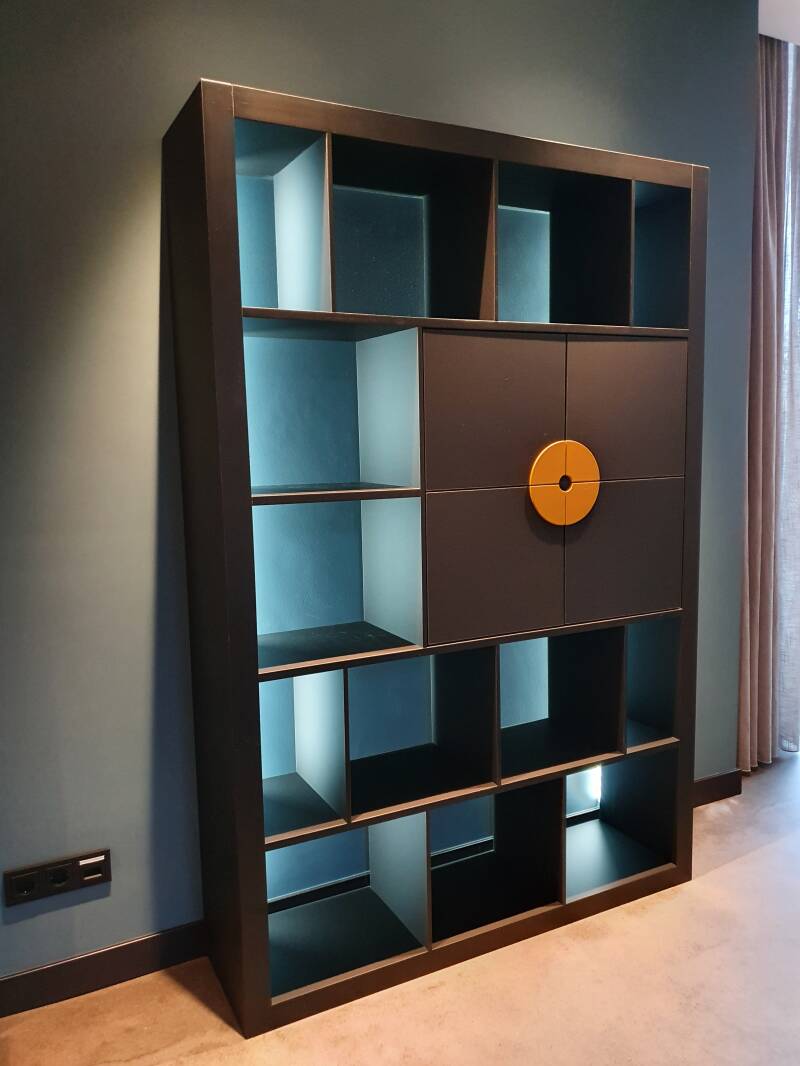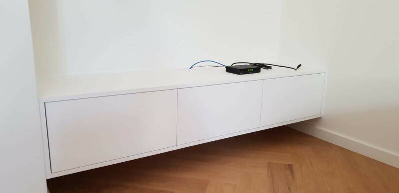 Modern tv meubel en een design opbergkast, beide met ledverlichting, en de vooraf aangeleverde impressie