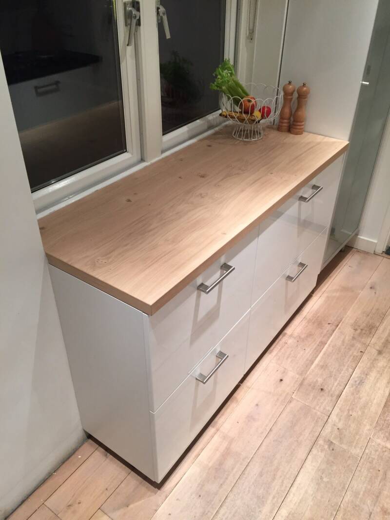 Hoogglans witte keukenkast met een gelakt rustiek eiken blad.