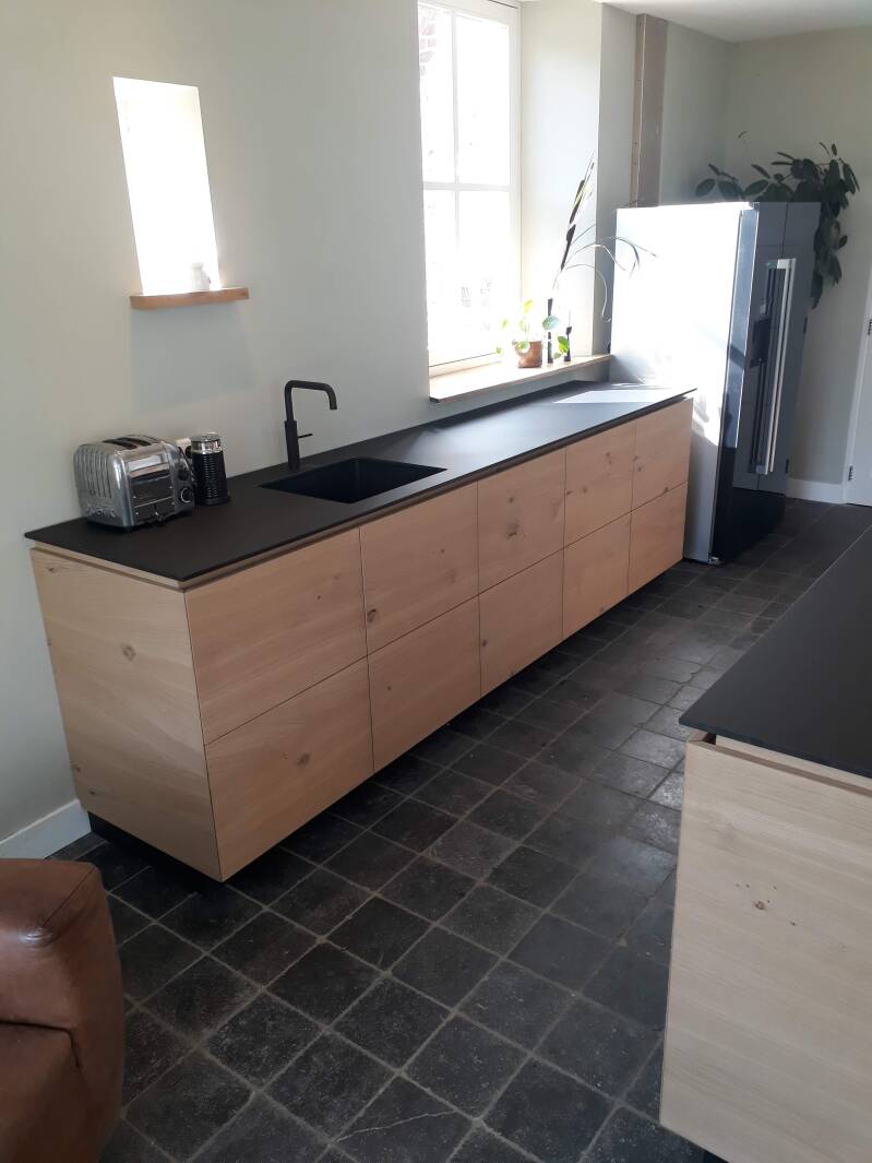 Keuken in een verbouwde boerderij waar modern mat donkergrijs is gecombineerd met karakteristiek eikenhout