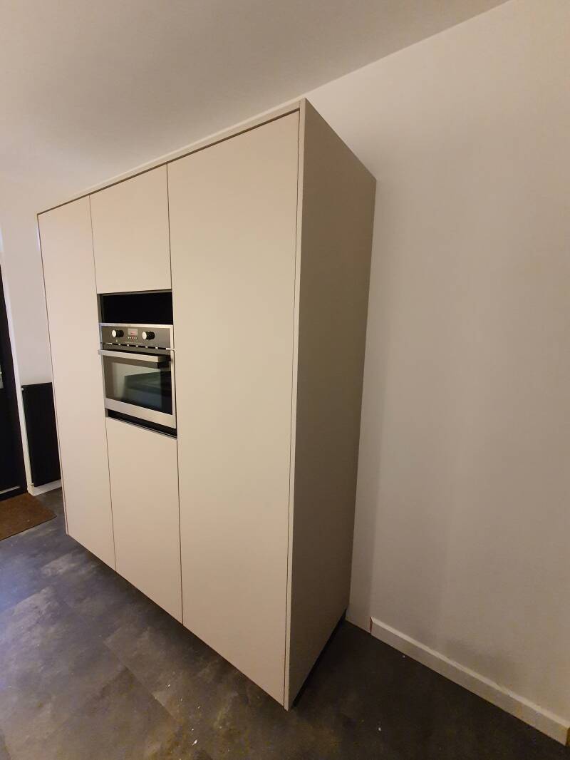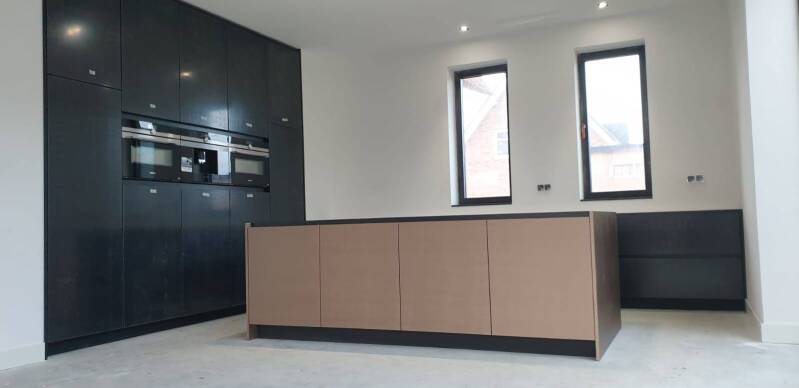 Eiland van mat gelakt eiken fineer gecombineerd met mat zwarte achterkasten en beton-look keramiek bladen.