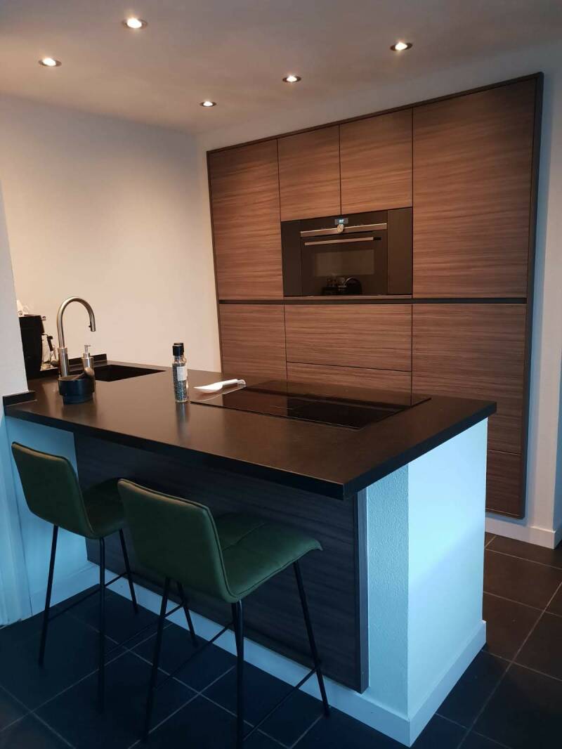 Moderne hout-look keuken met ingebouwde kastenwand en een composiet blad met zit gedeelte en kookplaat met bladafzuiging