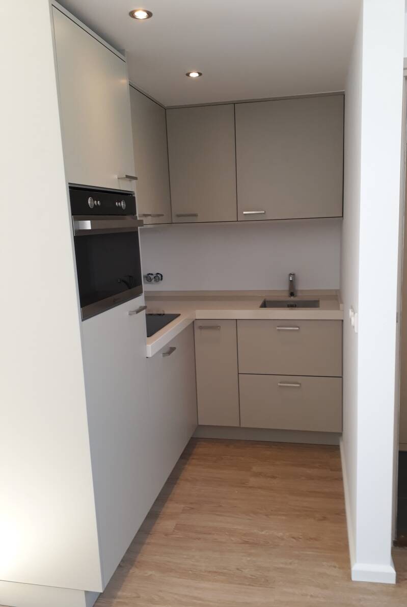 Moderne mat zwarte kastenwand gecombineerd met een strak mat wit eiland en composiet blad