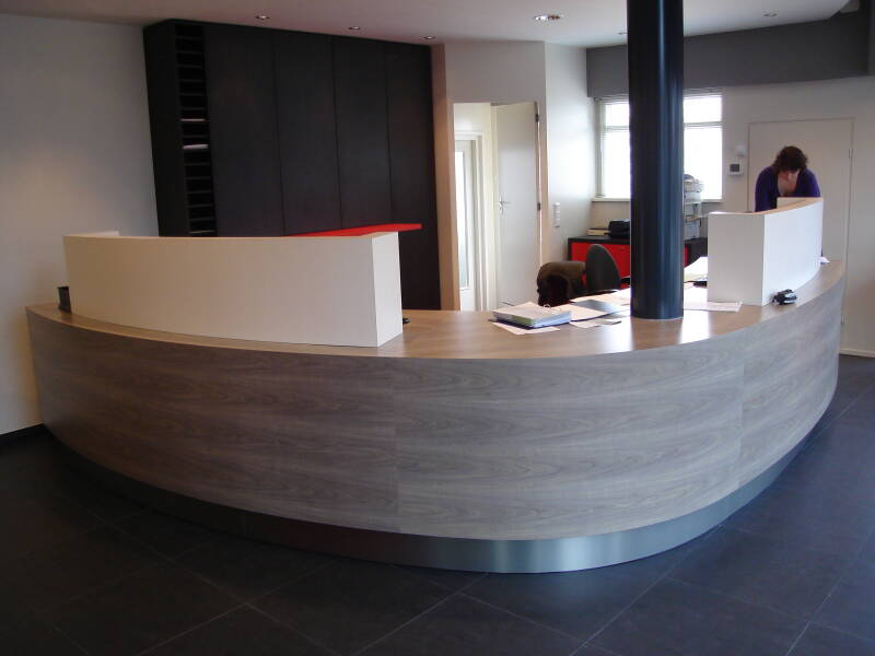 Een ovale balie voor een bouwbedrijf met op maat gemaakte kasten